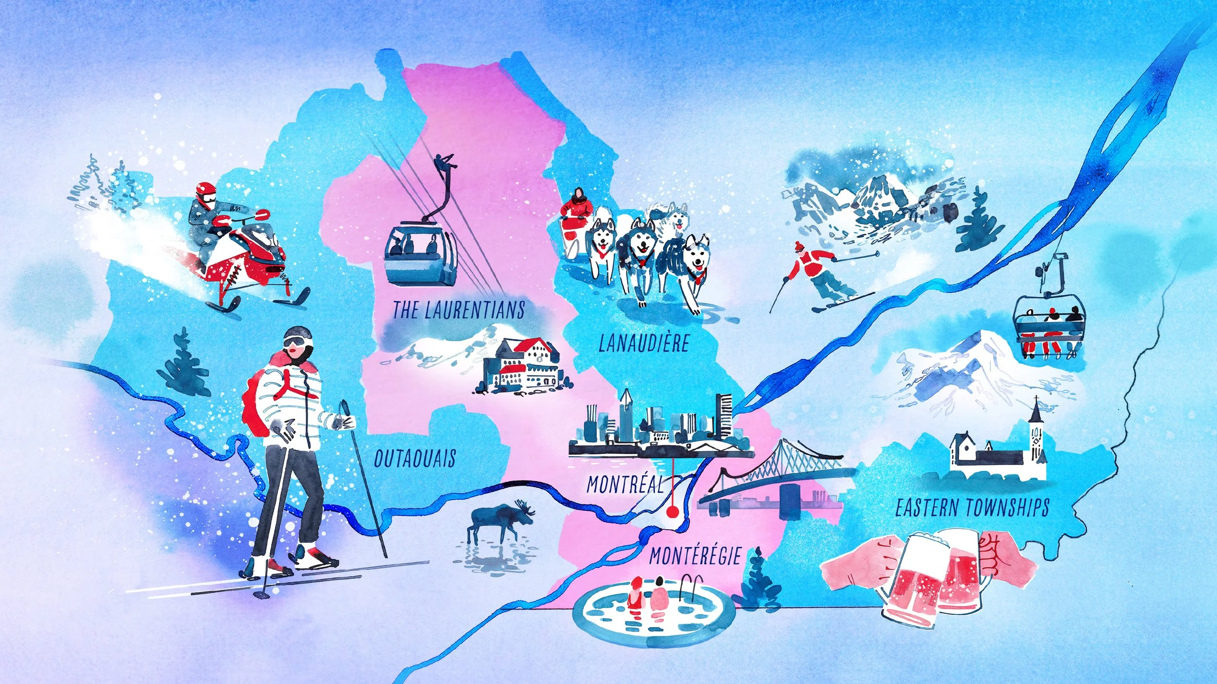 Drive awareness for short stay getaways to Mnotreal and surrounding regions during winter. Illustration by Ben Pearce
